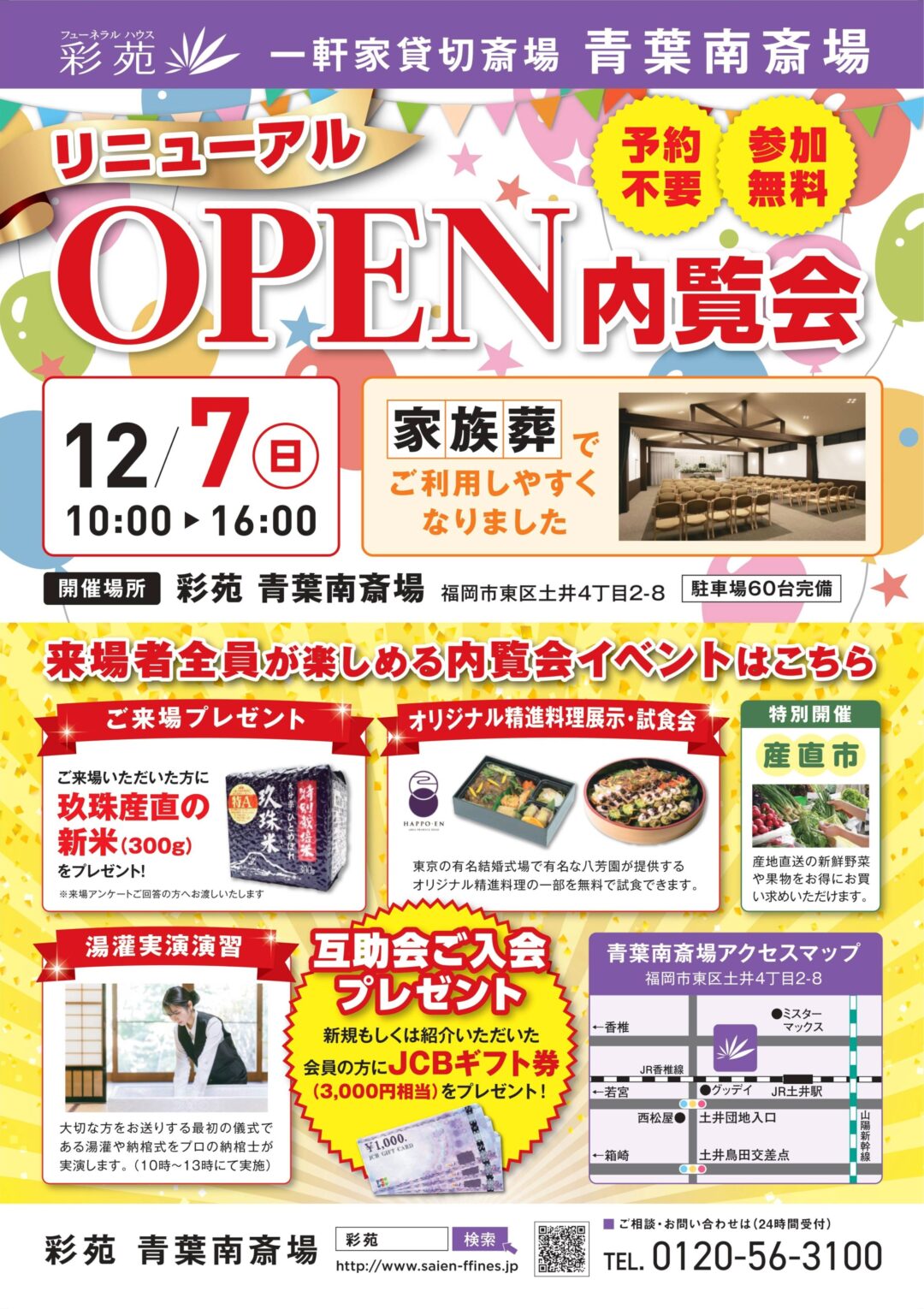 2025年12月7日(日)10:00~16:00に、青葉南斎場のリニューアルOPEN内覧会を開催します。