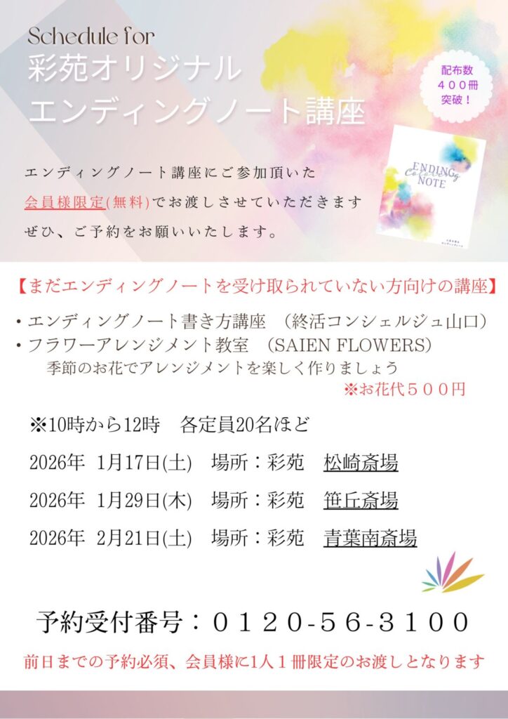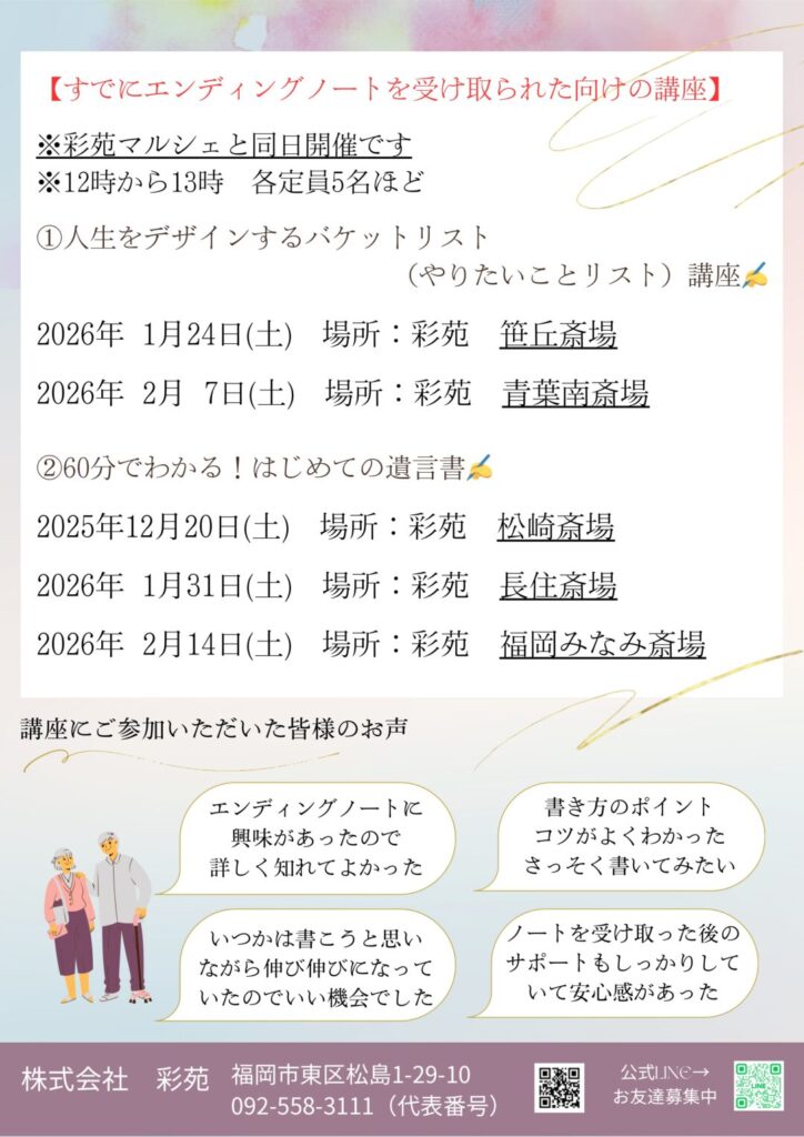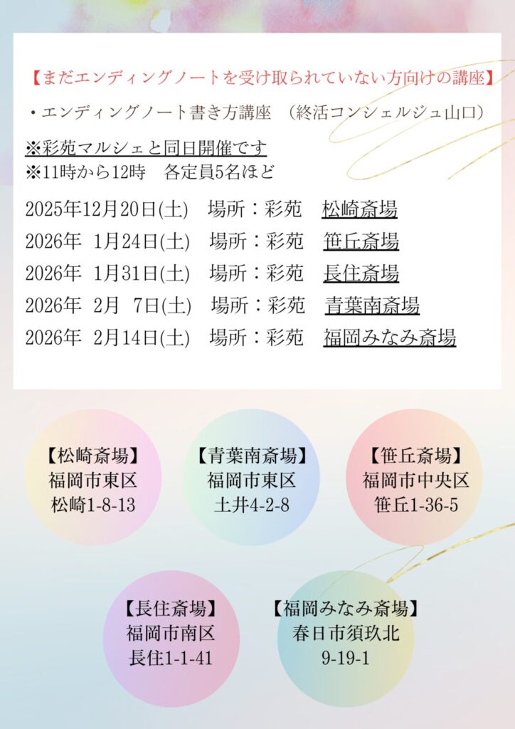 2025年12月~2026年2月に開催するエンディングノート講座の予定表を公開いたしました。